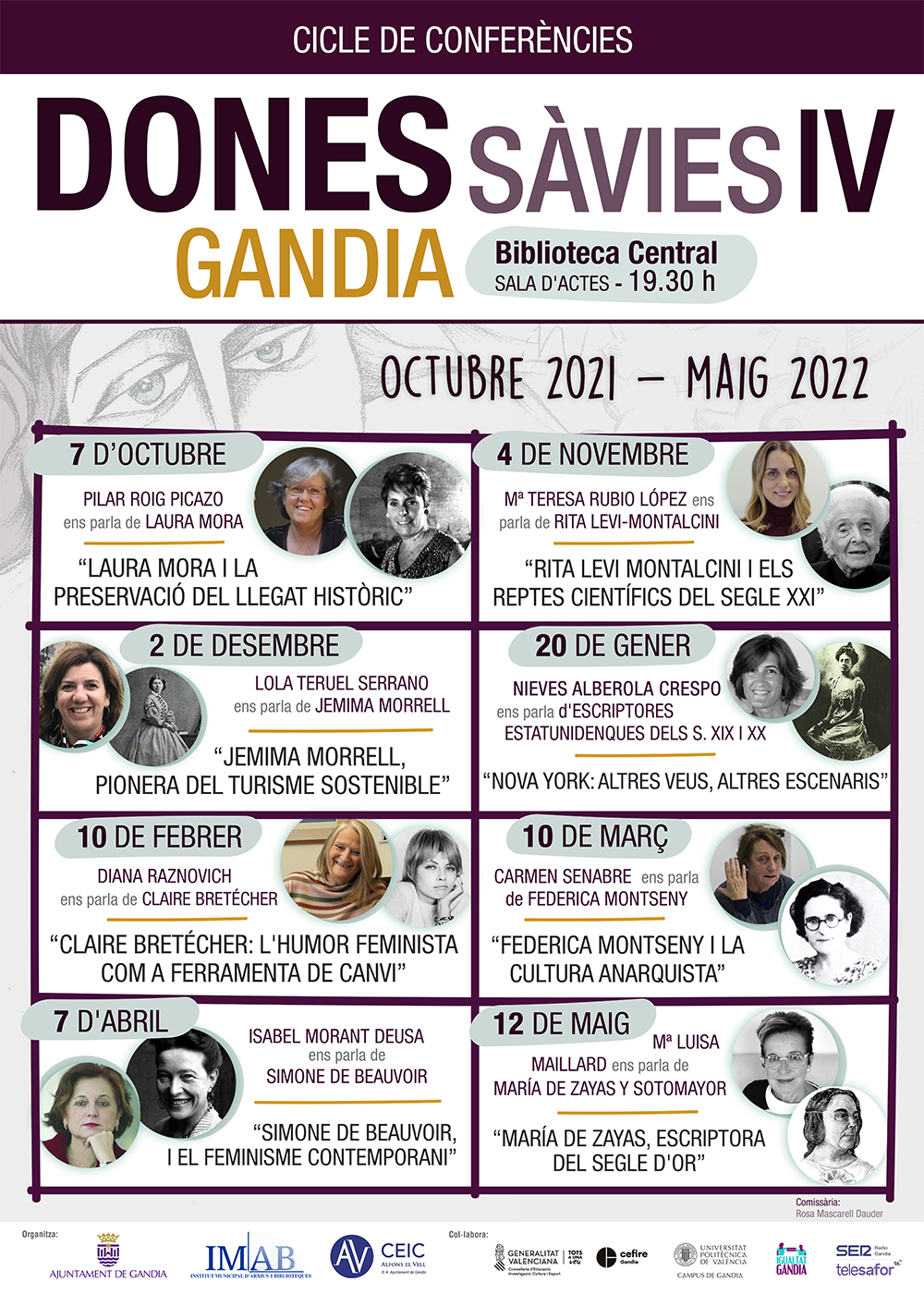 Dones Sàvies propone un ciclo de conferencias en las que, de la mano de académicas, científicas y divulgadoras, se da visibilidad a la contribución de ocho mujeres de referencia en los ámbitos de la historia, la ciencia, el arte, el turismo, la literatura, la política o el feminismo, entre otros. Las conferencias comenzaros en octubre de 2021 hasta mayo de 2022, celebrándose una por mes, en el Salón de Actos de la Biblioteca Central de Gandia a las 19.30 h.