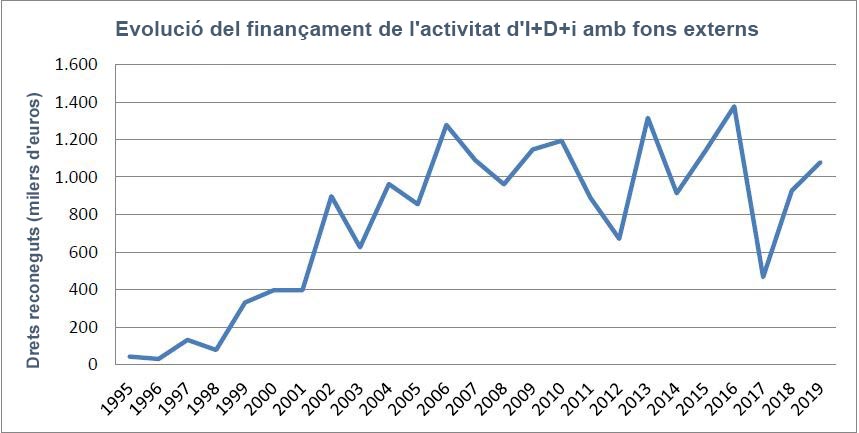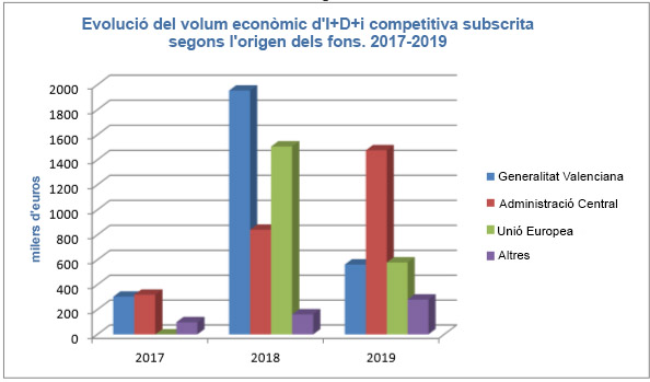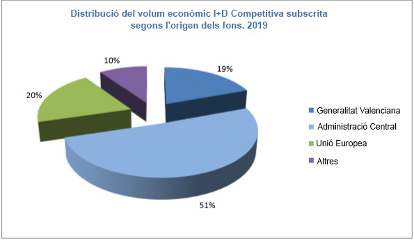 Pel que fa a l’activitat de l’R+D+i competitiva, la meitat del volum econòmic prové de l’Administració Central, que aporta el 51% del total dels fons, la qual cosa suposa un augment considerable en comparació amb les xifres de 2017 i 2018.