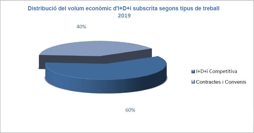 Un 40% del volum correspon a contractes i convenis subscrits, mentre que el 60% prové d’ajudes competitives, percentatge al qual se li atribueix un total d’1.959.000 euros, xifra que supera el doble de l’import del 2018 (842.000 euros).
