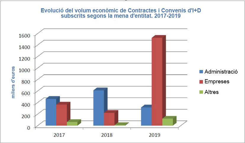 Per la seua part, els contractes i convenis d’R+D subscrits el 2019 han sigut principalment amb empreses, seguits per contractes/convenis amb l’administració i amb altres entitats (universitats, centres d’investigació, associacions empresarials i instituts). D’aquesta manera, el volum econòmic de contractes i convenis amb empreses (78%) ascendeix notablement respecte a les xifres obtingudes en els tres últims anys.