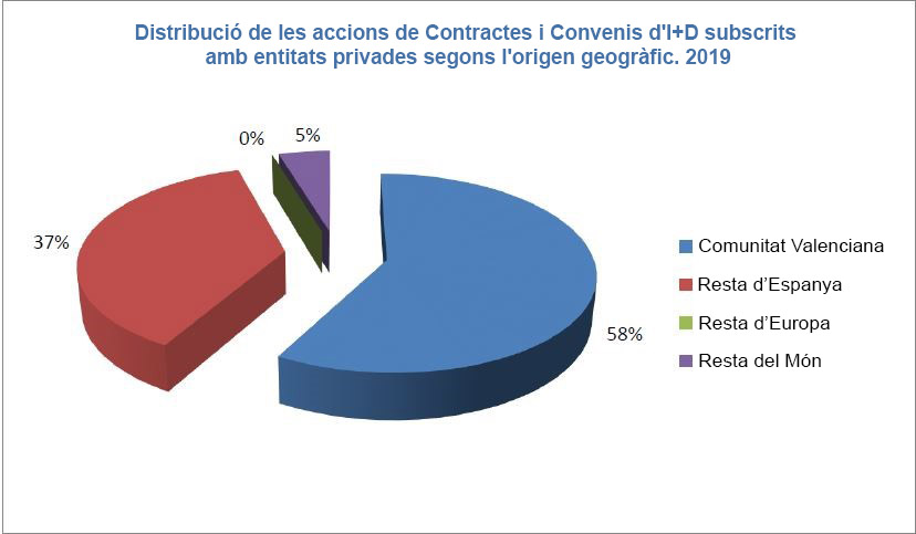 Quant a la distribució espacial de les accions contractades, el 58% prové d’empreses de la Comunitat Valenciana i el 37% de la resta d’Espanya, cosa que indica un gran impacte de la investigació duta a terme al Campus en el seu entorn socioeconòmic més pròxim. Al seu torn, un 5% de les accions té el seu origen en empreses internacionals (no europees).