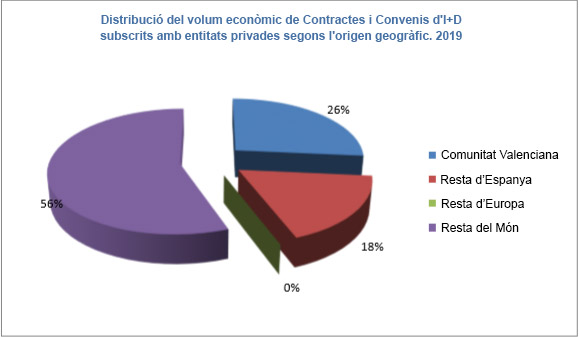 En l’anàlisi de l’origen geogràfic dels fons, també s’observa un gran increment del volum econòmic dels contractes i convenis d’R+D subscrits amb entitats internacionals (no europees), ascendint des de la xifra de 5.000 euros l’any 2018 a 851.000 euros en l’any 2019, la qual cosa representa el 56% del volum total.