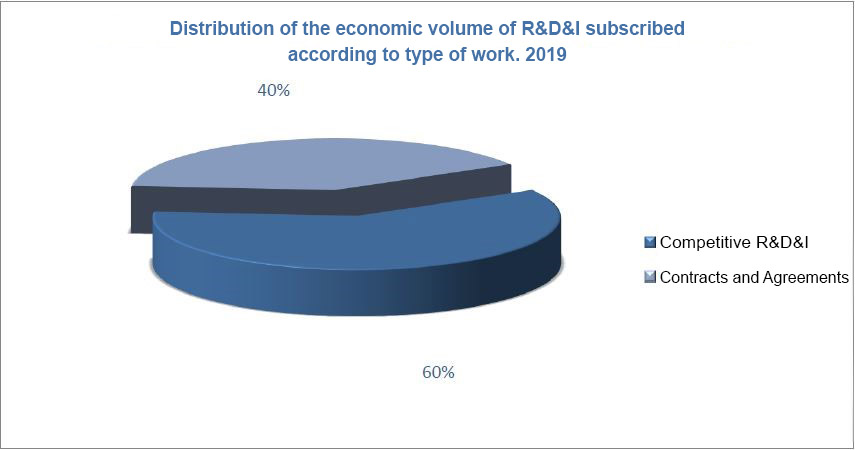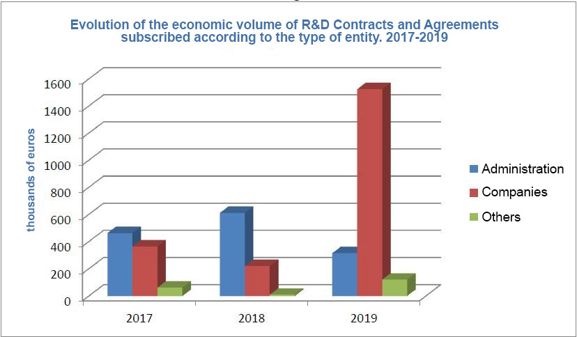 As for the R&D contracts and grant agreements signed in 2019, they have mostly involved businesses, followed by contracts/agreements with the administration and with other entities (universities, research centers, business associations and institutes). Thus, the financial volume of contracts and agreements with businesses (78%) has risen significantly with respect to the figures obtained in the last three years.