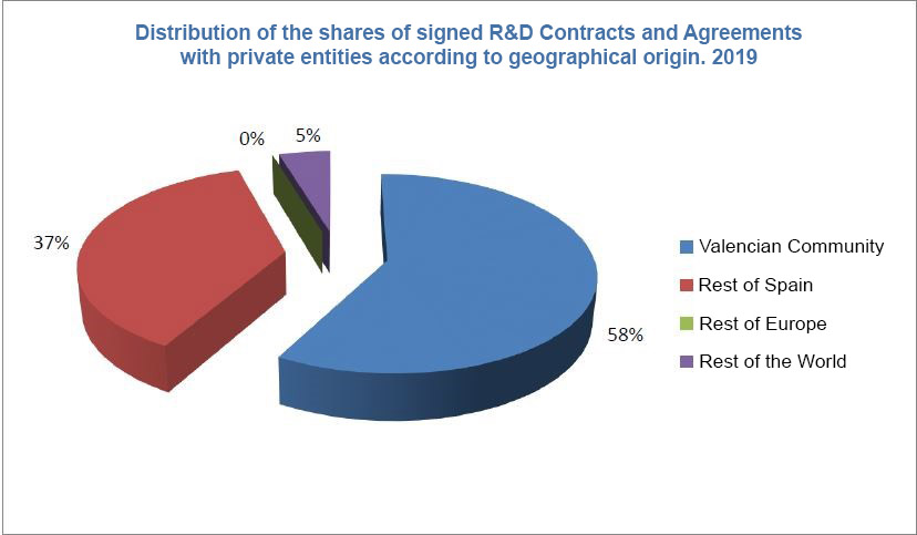 With respect to the spatial distribution of the actions contracted , 58% came from businesses in the Valencian Community and 37% from the rest of Spain, which indicates the tremendous impact that the research from the Campus on its immediate socio-economic environment. In turn, 5% of the actions originate from international (non-European) businesses.