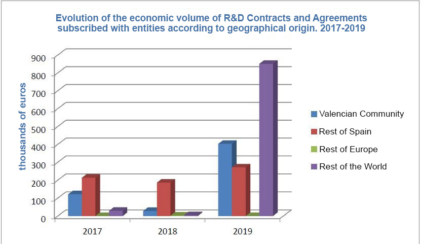 In the analysis of the geographical origin of the funds, there is also a large increase in the financial volume of R&D contracts and agreements signed with international (non-European) entities, increasing from the sum of 5,000 euros in 2018 to 851,000 euros in 2019, representing 56% of the total volume.